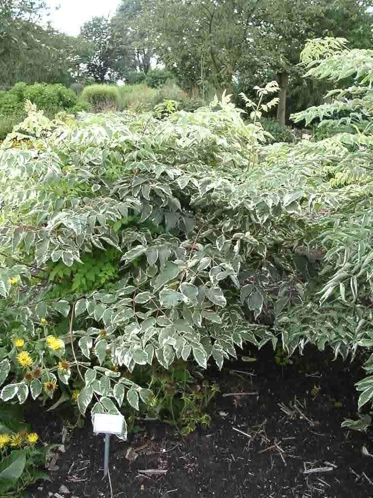 Blatter: Sommergrün, wechselstandig, doppelt gefiedert, bis 70 cm lang, Blättchen dünn, bis 12 cm lang, dunkelgrün und unregelmassig weiss gerandet, sehr auffallend.