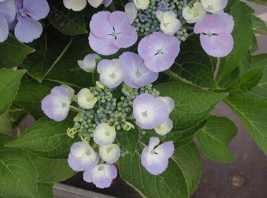 schirmförmige Blüten, Randblüten rosalila, auf saurem Boden mehr blaulila, in der Mitte bläulich-weiss.