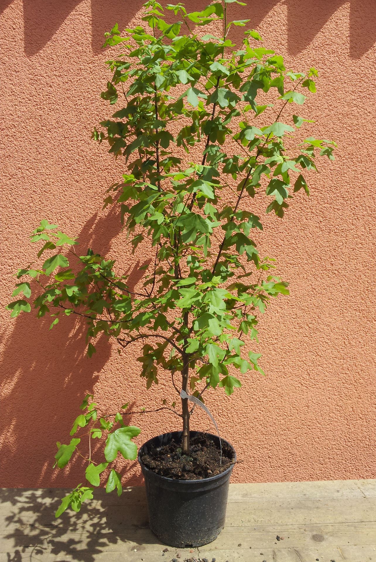 Die mit Acer campesire verwandte Ahorn - Art, die rund um das Mittelmeer auftritt, bildet einen kleinen, huschartigen Baum aus, der etwa 6-10m hoch wird. Er hat dunkelgrüne, relativ dicke Blätter von 3,5 5cm Länge mit je drei stumpfen Lappen. Blüten in aufrechten oder auch hängenden Schirmtrauben, gelbgrün. Staubgefässe der männlichen Blüten doppelt so lang als die Blumenkrone. Flügel der Früchte vorwärts gerichtet, etwas abstehend, oft mit den Rändern sich deckend. Der Baum verträgt Trockenheit gut und ist zudem frosthart. Seine kompakte Krone macht ihn als Strassenbaum und für Rasenflächen in Vorstadtgärten geeignet. Im Herbst nimmt er eine rötliche Färbung an.