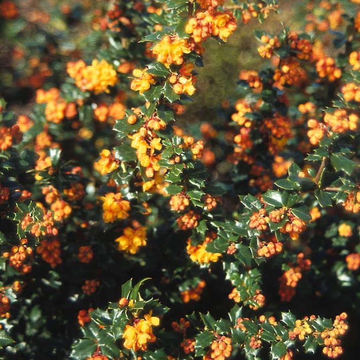 Dicht verzweigter und breit wachsender Strauch. Immergrün. Höhe ca. 2,5 m. Zweige dornig. Blatt glänzend dunkelgrün. Blüten auffällig orange im Mai-Juni. Blaue bereifte Beeren im Herbst. Gedeiht auf allen Gartenböden.
