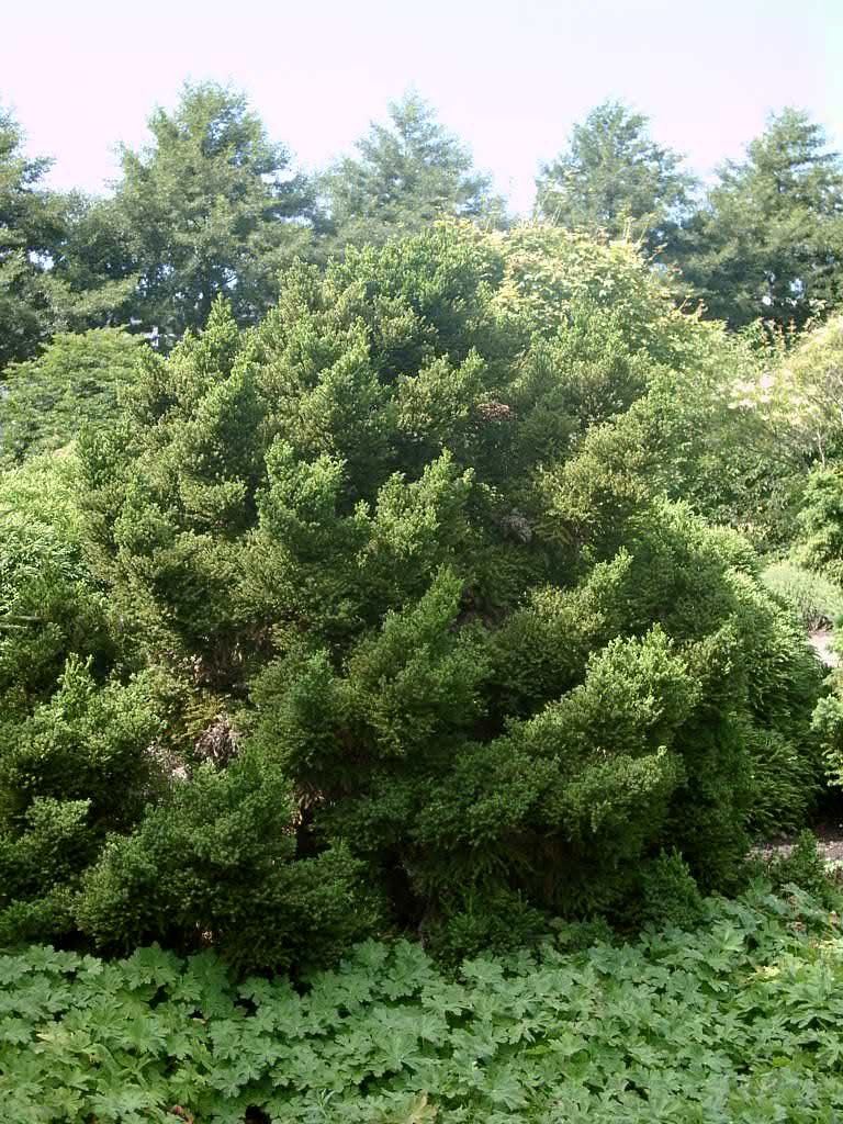 Sicheltanne eineKompakte Zwergkonifere. Breit ausladender, kegelförmiger Wuchs. Langsam wachsend. Höhe bis 2 m. Laub dunkelgrün, im Winter braun gefärbt. Heller, geschützter Standort. Leicht feuchte und sauere Böden. Dekorative Einzelpflanze.