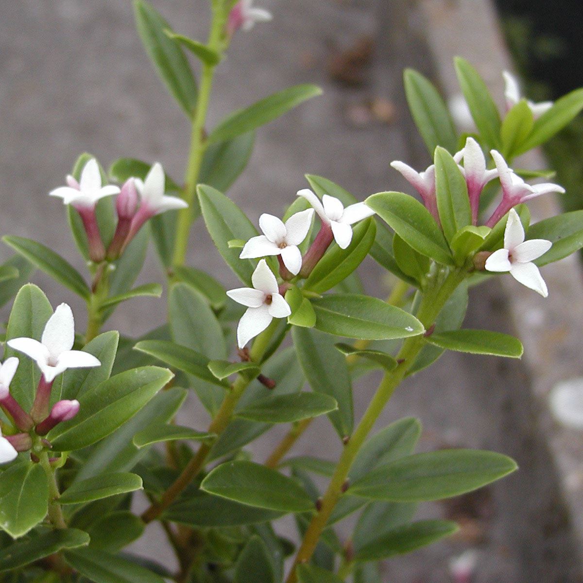 Wintergrüner kompakt wachsender Strauch. Höhe ca. ,5 m. Glänzend dunkelgrün und etwas ledriges Laub. Lila-rosa Blüten in kleine Trauben. Stark duftend. Blühzeit Mai bis Juni. Humusreicher, kalkhalt...