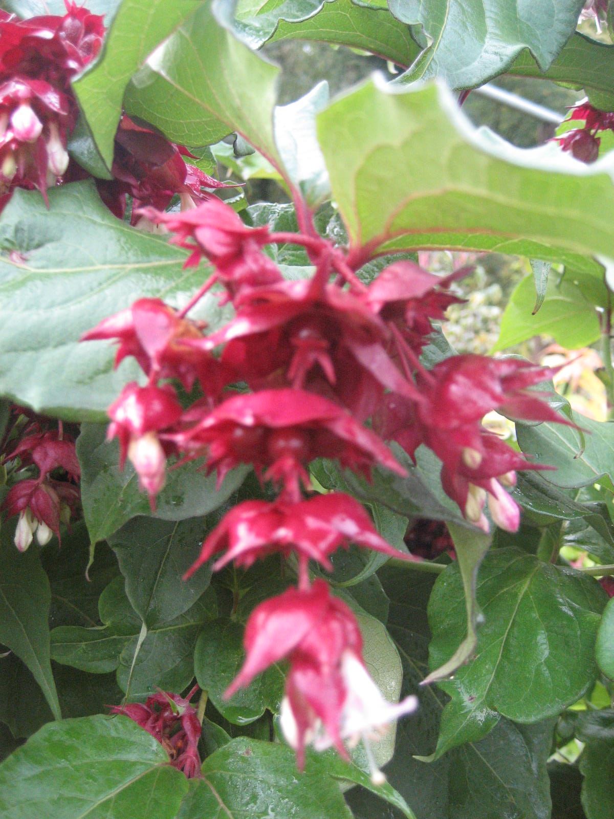 Aufrechter, sommergrüner Strauch mit stark überhängendem Wuchs, ca. 1,5 hoch. Weisse hängende Blütenähren mit violett-roten Schaublättern im Juli bis September. Sonniger, geschützter Standort. Leycesteria formosa im Frühjahr zurückschneiden.