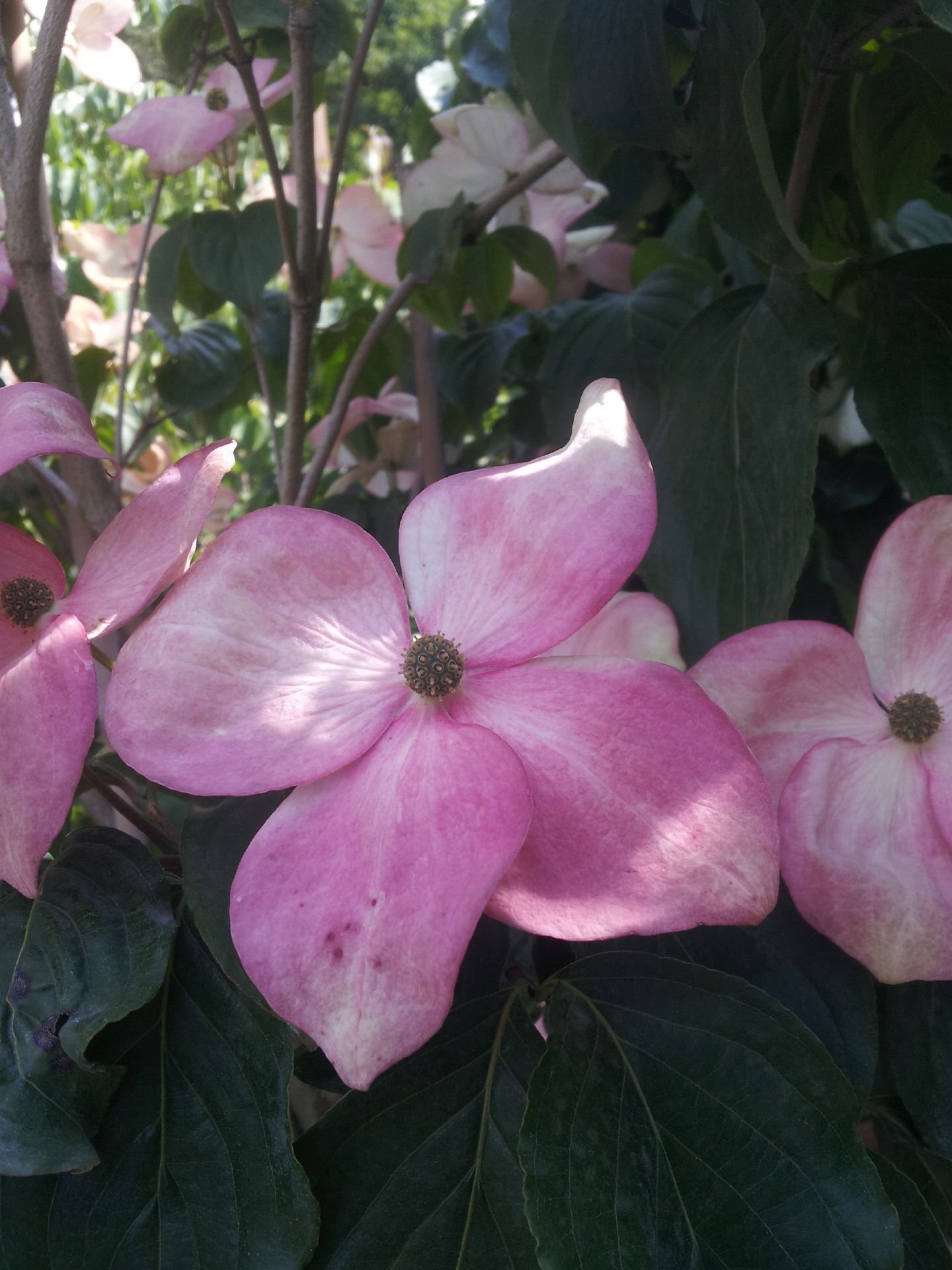 Grossstrauch oder kleiner Baum. Höhe 4-6 m. Krone zuerst aufrecht, später rund wachsend. Dunkelgrünes Blatt. Im Herbst dunkelpurpurrot. Blüten von 4 grossen, rosaroten Hochblättern umgeben. Mai-Juni. Rote essbare Früchte im Herbst. Cornus kousa 'Satomi' benötigt einen geschützten Platz im Garten und nahrhaften, humosen Boden.