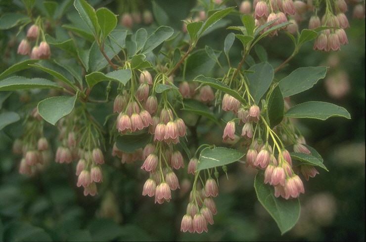 Sommergrüner Strauch mit roten Zweigen. Höhe bis 2.5 m. Blatt mattgrün, quirlförmig angeordnet. Herbstfärbung knallrot. Glöckchenförmige, herabhängende, perlweisse Blüten mit roten Nerven. Mai-Juni...