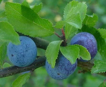 Fruchtreife: beginnt etwa Mitte September/Oktober. Die Früchte sind etwa 10 bis 15 mm große, rundliche Steinfrüchte, die einen Stein enthalten und im reifen Zustand tief dunkelblau gefärbt und häufig bereift sind. Die Früchte verbleiben bis in die Wintermonate an der Pflanze. Zunächst besitzen sie einen herben, stark zusammenziehenden Geschmack, der sich allerdings mit mehrmaligem Durchfrieren allmählich verliert.