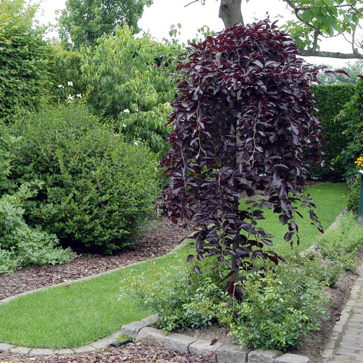 6-8m, Blatt: tiefrot, überhängende Äste, Stammhöhe abhängig von der Veredlung, für Einzelstellung,
