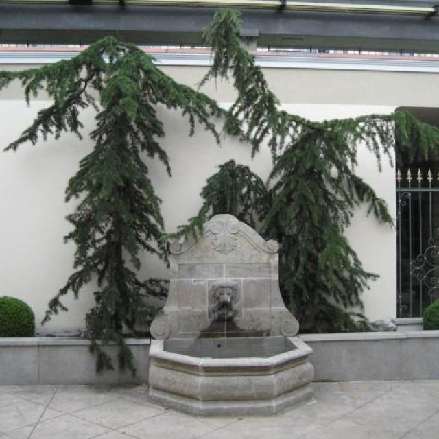 Nadelbaum als Trauerform ohne Leittrieb, Zweige fallen bis zum Boden. Dunkelgrüne Benadelung und dunkelgraue Rinde. Sehr majestätisch
