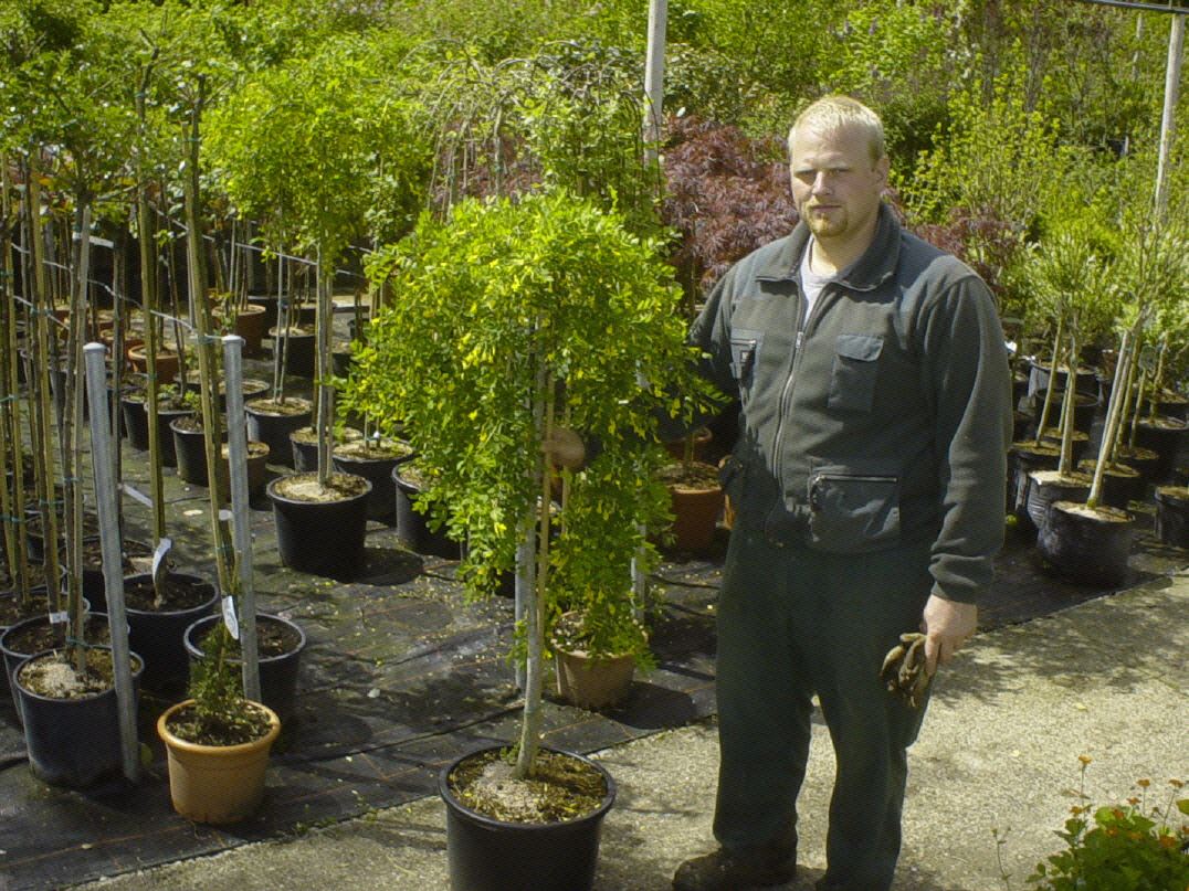 Baum mit Kronenveredlung, mit bis zum Boden herabhängenden Zweigen, Höhe richtet sich nach Veredelungshöhe, die bei 2 2,50 m liegt, bis 1 m breit.