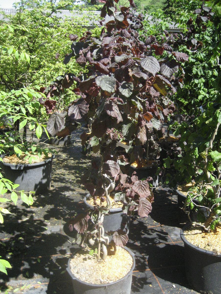 Neue Sorte der beliebten Korkenzieherhasel. Sie unterscheidet sich von der einfachen Korkenzieherhasel durch das wundervoll gefärbte rote Laub.