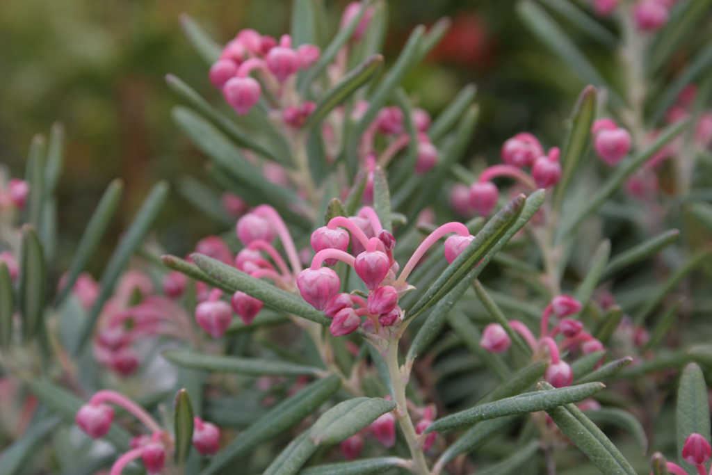 Immergrüner stark verholzender Strauch. Bis 4 cm hoch. Breite bis 6 cm. Lederartiges, grau-grünes Laub. Kleine, hellrosa Blüten in Trauben. Mai bis Juni. Für sonnige, nicht zu trockene, leicht saure Standorte.
