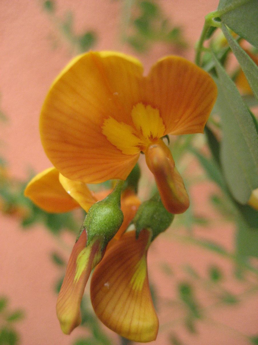 Blüte/Frucht: Oranger Blasenstrauch, braun-getuschte Schmetterlingsblüten in Trauben