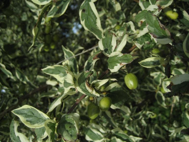 Wuchs: Grossstrauch, der im Alter oft baumförmig ist. Ca. 3-5 m hoch. Im Alter langsamwüchsig mit überhängenden Zweigen.