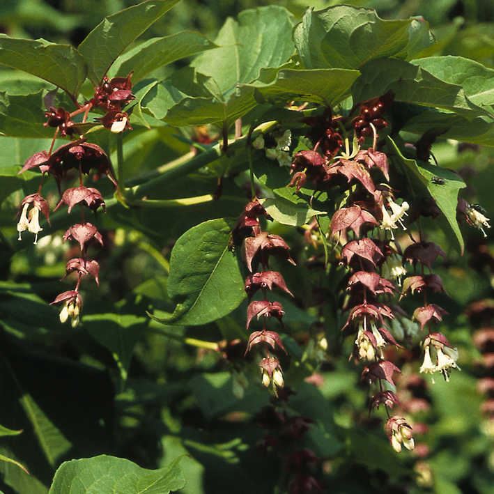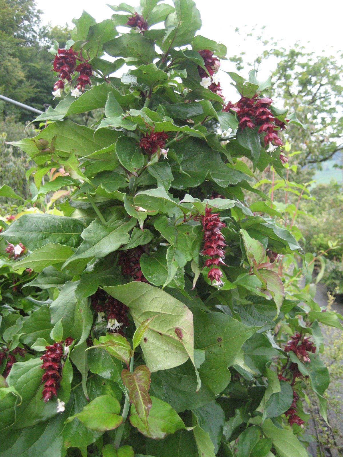 Aufrechter, sommergrüner Strauch mit stark überhängendem Wuchs, ca. 1,5 hoch. Weisse hängende Blütenähren mit violett-roten Schaublättern im Juli bis September. Sonniger, geschützter Standort. Leycesteria formosa im Frühjahr zurückschneiden.