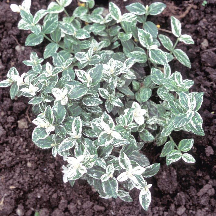 Schwachwachsende amerikanische Sorte mit kleinen (1-3 cm) grünen, stark rahmweiss panaschierten Blättern, im Austrieb gelblich weiss - auffallender Bodendecker.