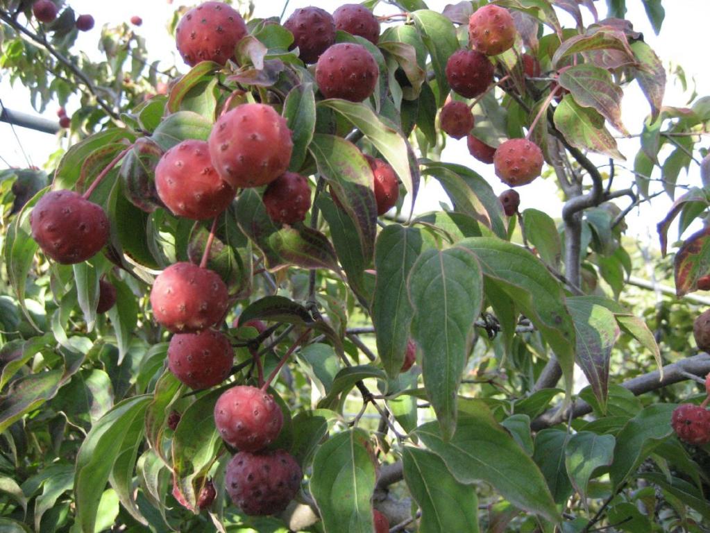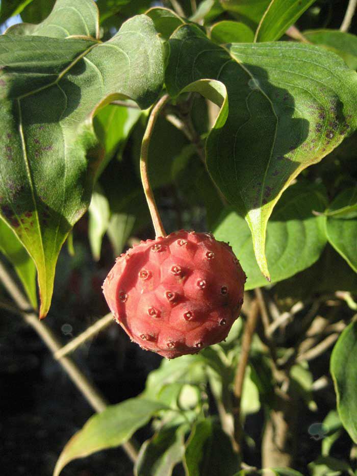 Chinesischer Blumen-Hartriegel 5-7m, breiter aufrechter Wuchs, Blatt: grün, leuchtendrote Herbstfärbung, Blüte: weisse Hochblätter, Juni, erdbeerartige Frucht, essbar, frische, saure Böden.
