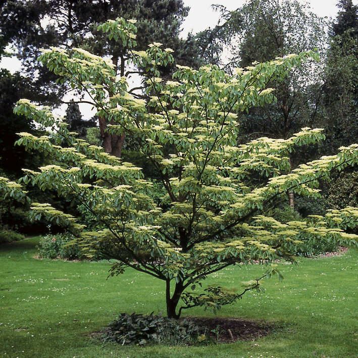 6-8m mittel Blüte: weisse Schirmrispen VI frische Böden Äste bilden pagodenförmige Etagen dekorativer Strauch