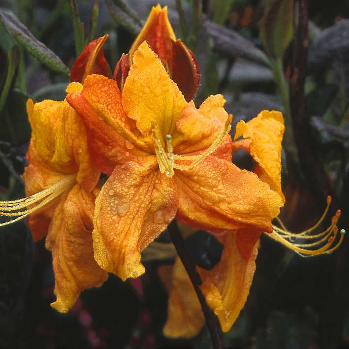 Aus den goldgelben Knospen entwickeln sich Blüten mit der gleichen Farbe, die rötlich orange geflammt sind. Attraktiv ist auch der braunrote Austrieb. 1,3 m.