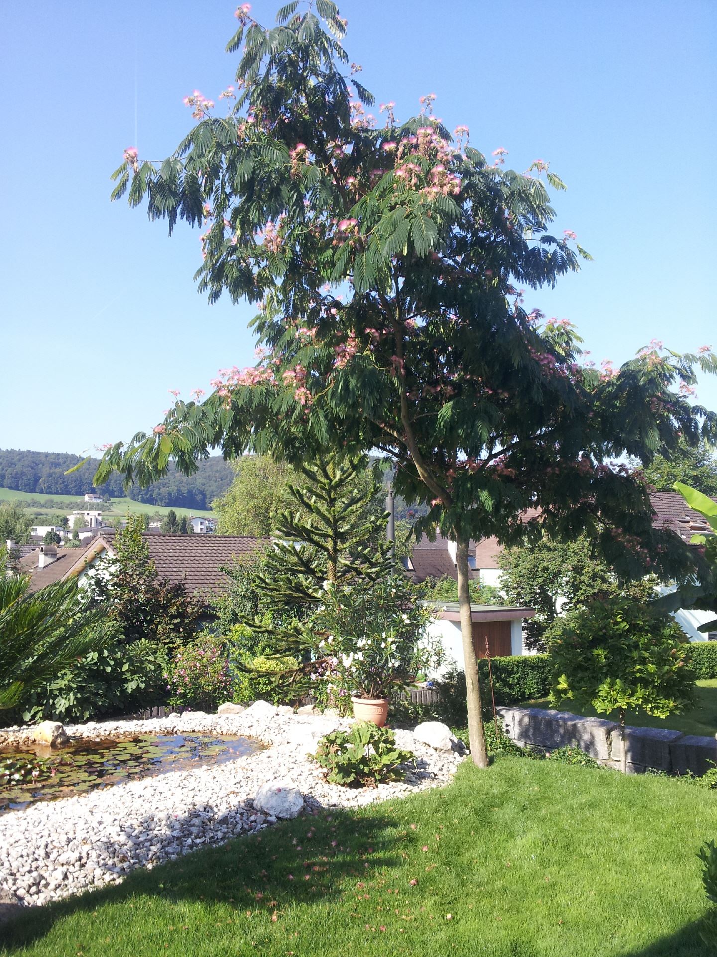Sommergrüner, akazienartiger Baum mit wundervollen Fiederblättern In der Gattung der Schirmakazien ist der Seidenbaum die Art, die am weitesten in den gemässigten Klimazonen verbreitet ist. Die sch...