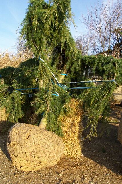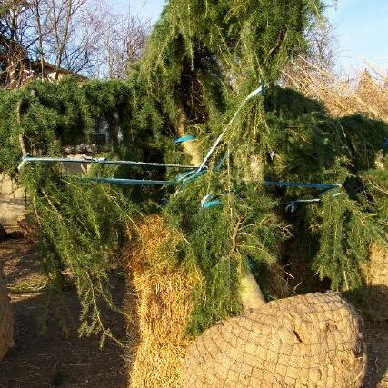 Nadelbaum als Trauerform ohne Leittrieb, Zweige fallen bis zum Boden. Dunkelgrüne Benadelung und dunkelgraue Rinde. Sehr majestätisch