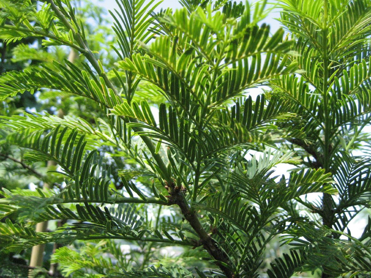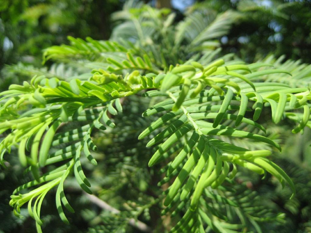 weiche, sommergrüne, 1 - 3 cm lange Nadeln, gegenständig. Reihig, oberseits blaugrün, unterseits hellgrün, Herbstfärbung braungelb bis rostfarben. Die Nadeln werden zusammen mit den Kurztrieben im Herbst abgeworfen