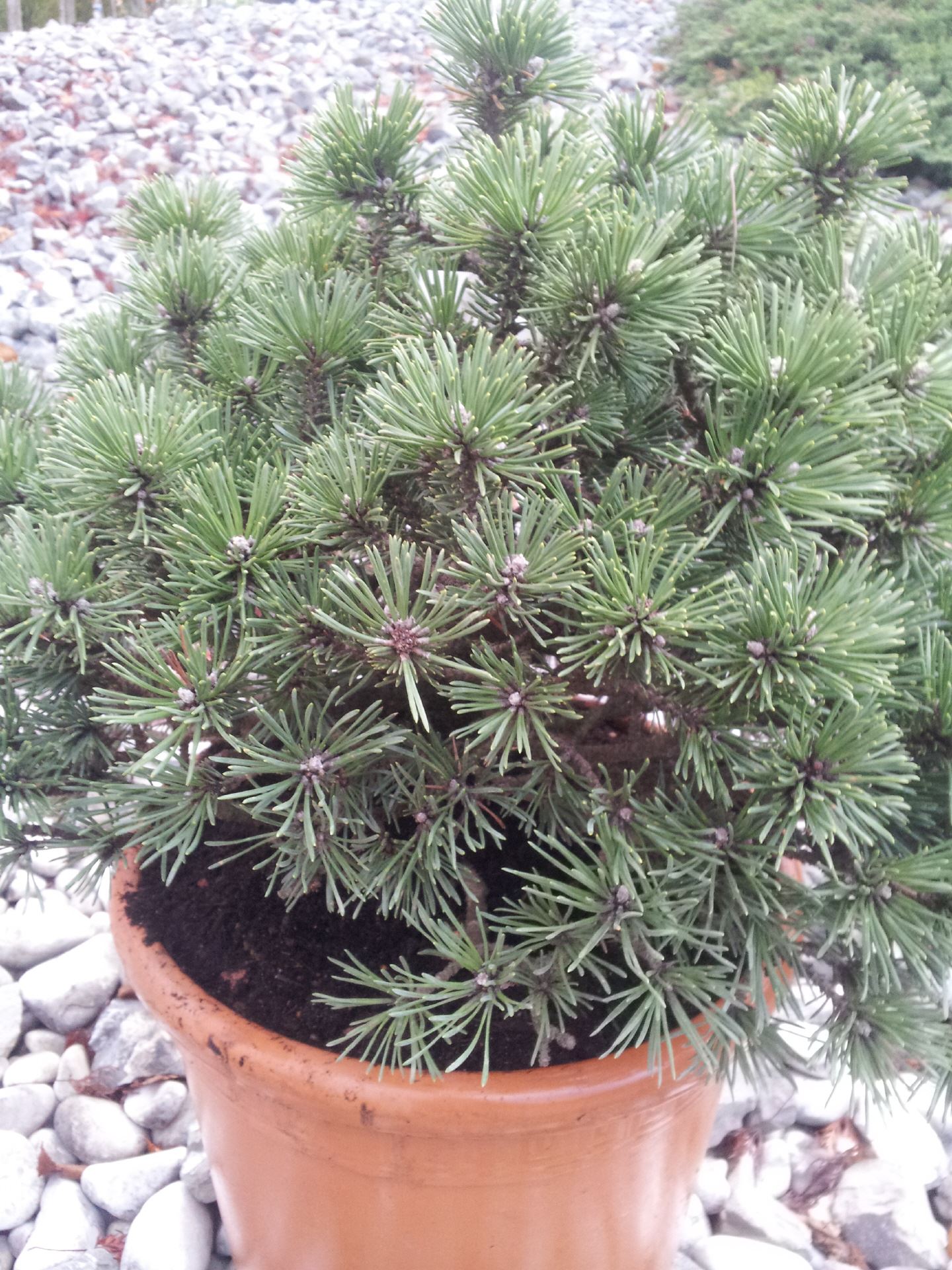 Nadelartig, Blau / Grüne Farbe. Nadeln zu 2,5 3,5 cm. Nadeln stehen dicht beieinander zu 2-3 mm, das macht die gedrungen form.