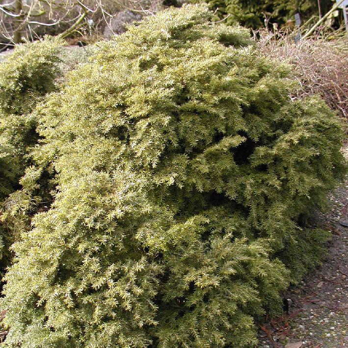 Kompakt wachsender Nadelbaum. Wintergrün. Breit kugelförmige Wuchs. Äste zierlich überhängend. Höhe bis 1 m, Breite ungefähr 1 m. Laub Frischchgrün, unterseits weisslich. Schöne Solitärpflanze. Son...
